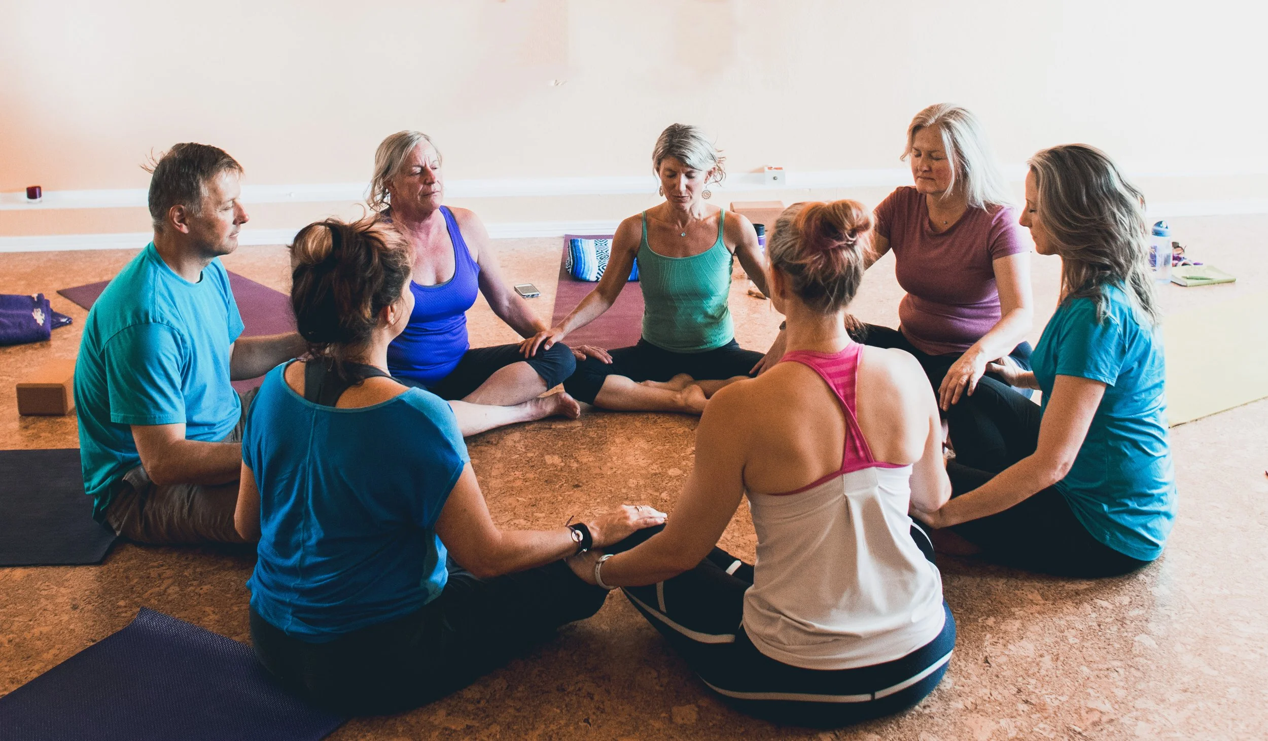 Group of women and one man sitting in a circle on yoga mats, practicing meditation or mindfulness in a yoga class.